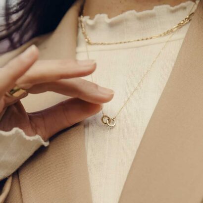 A pair of gold circles are linked together and attached to a chain with jump rings; the chain is secured by a spring ring clasp.